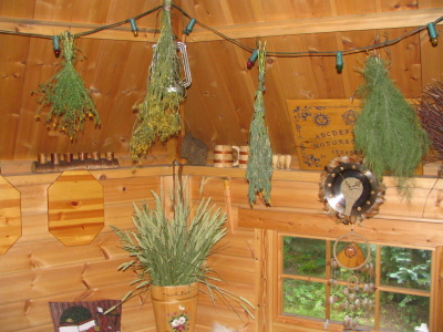 2 gehäufte Tassen Löwenzahnblüten 1 l Wasser 1500 g Rohrzucker 1 unbehandelte Zitrone 1 unbehandelte Orange Die Blüten in dem Wasser kurz aufkochen, den Rohrzucker und die in Scheiben geschnittene Orange und Zitrone dazugeben. Auf kleiner Flamme köcheln lassen bis alles auf Honigdicke eingekocht ist. Damit kann die ideale Entschlackungskur im Frühjahr gemacht werden. Vor jeder Mahlzeit sollten 1 - 2 Löffel davon genommen werden. Zurück zum Überblick Fichtennadelsirup 2 Doppelhände frischer Fichtennadeltriebe 1 l Wasser 1 kg Rohrzucker 1 unbehandelte Zitrone Die Fichtennadeltriebe mit dem Wasser kurz aufkochen. Über Nacht ziehen lassen. Am nächsten Tag den Sud durch ein Sieb gießen und gut ausdrücken. Den Rohrzucker und die in Scheiben geschnittene Zitrone dazugeben. Alles auf kleiner Flamme sirupartig einköcheln lassen. Achtung: Einen großen Tropf verwenden, da der Sirup beim Kochen stark schäumt!! Dieser Sirup ist gut geeignet bei Erkältungen und Husten. Täglich 3 x 2 Teel. davon einnehmen. Zurück zum Überblick Marians blessing Dieses Rezept kommt aus England und wurde mir ebenfalls von Robert Locksley zugeschickt. Dieser Erkältungstrunk hilft, den bösen Viren ein Schnippchen zu schlagen. Man köchelt eine große Tasse Wasser mit 1/2 Tl. Zimt und 2-3 Gewürznelken ca. 2-3 Min. gerade mal so vor sich hin, abseihen, mit Honig oder Kandis süssen, 2-3 Tassen täglich und die Viren haben es sehr schwer. Zurück zum Überblick Hustentee bei festsitzemden Husten Eine Spezialteemischung bei festsitzendem Husten und Bronchitis: 1 Teel. Spitzwegerich 1 Teel. Huflattich 1 Teel. getrocknete Alant-Wurzel (gibt es in der Apotheke) 1 Teel. Anis 1 Teel. gerockneter Ingwer - oder natürlich kann man auch frischen Ingwer dazugeben. Die Kräuter mit 1/4 l kalten Wasser aufsezten und zum köcheln bringen. Dann vom Herd nehmen, 10 Min. ziehen lassen. Mit Fenchelhonig süßen und in kleinen Schlucken möglichst heiß trinken! Außerdem ist direkte Wärmeeinwirkung oft sehr hilfreich. Ein erwärmtes Körnerkissen für 15 Min. auf die Brust legen tut sehr gut und entspannt die verkrampften Atemweg. Natürlich kann man auch warme Packungen aus Fango oder Kartoffelbrei verwenden, das Körnerkissen ist aber sicher die praktischere Variante. Zustätzlich kann man die Atemwege noch mit einer ätherischen Einreibung entlasten. Natürlich gibt es die fertig in der Apotheke zu kaufen. Einfach, preiswert und oftmals viel besser in der Zusammensetzung der Salben, ist aber die eigene Herstellung eines Erkältungsbalsams. Die käuflichen Präparate werden oftmals mit Vaseline hergestellt. Vaseline ist ein Abfallprodukt der Erdölgewinnung. Zurück zum Überblick Elixiere und Tinkturen Baldriantinktur Beim Baldrian werden die Wurzeln verwendet. Die getrockneten Wurzeln werden kleingeschnitten. Auf 20 g Wurzeln nimmt man 100 ml 70%igen Alkohol. Zurück zum Überblick Knoblauchtinktur 125 g Knoblauch zerdrücken mit 1/2 Liter Brantwein (60%) übergießen. 2 Wochen in einer hellenen Flasche in der Sonne stehen lassen, dann abgießen. Täglich 10 Tropfen mit Zucker einnehmen. Knoblauchtinktur wirkt beruhigend bei Magen- und Darmkatharr und bei Arterienverkalkung Zurück zum Überblick Über das Sammeln, Trocknen und die Verwertung von Kräutern Goldene Regel beim Sammeln Diese Regel lautet: Nimm immer nur so viele Kräuter, wie du auch wirklich brauchst. Eine gute Kräuterhexe wird natürlich darauf achten, dass sie nicht unnötig viele Kräuter sammelt und dass sie beim Sammeln nicht andere Pflanzen niedertrampelt. Auch werden wir niemals alle Pflanzen an einer Stelle sammeln. Denn wir wollen ja im nächsten Jahr wiederkommen und auch dann wieder unsere Kräuter dort vorfinden. Zurück zum Überblick Kräuter richtig trocknen Damit die frischen und duftenden Kräuter auch richtig trocknen, werden sie in kleinen Bündeln aufgehängt. Am besten ist dazu ein schattiger, trockener Ort geeignet, der auch eine gute Luftzirkulation hat. Ich hänge sie im Sommer auf meiner überdachten Terrasse auf. Sie sind gleichzeitig ein schöner Schmuck, wenn sie da in Bündeln hängen. Oder ich hänge sie auch schon mal in meine Grillhütte, sie auf dem Foto zu sehen ist. Man sollte sie aber nicht zu lange hängen lassen, damit sie von ihrem Aroma nicht zuviel verlieren. Bevor sie dann weiterverarbeitet werden sollten sie aber unbedingt noch einmal in einer Kräuterdarre nachgetrocknet werden. Sonst kann es leicht passieren, dass sie schimmeln und verfaulen. Anstelle der Darre benutze ich meinen Heißluftbackofen, den ich bei offener Tür mit 50°C warmer Umluft beheize. Ein Backofen ohne Umluft ist nicht so gut geeignet. Auf alle Fälle sollte aber immer die Backofentür offen bleiben. Meistens reichen 10 bis 15 Minuten aus, wenn sie ordentlich vorgetrocknet wurden. Das Kraut ist wirklich trocken, wenn es richtig knistert und raschelt beim Abrebeln der Blätter und Blüten. Das ist dann die nächste Arbeit. Die nun trockenen Kräuter müssen dann von ihren Stengeln gerebelt werden. Das mache ich dann gleich auf den Backblechen aus meinem Herd - und bevorzugt auch auf der Terrasse, da es doch einige Schweinerei macht, wenn die Kräuter so weiterverarbeitet werden. Wenn sie dann von allen Stengeln befreit sind, dann reibe ich sie noch einmal mit zwischen den Fingern fein. Erst dann werden sie in Blechdosen oder dunkle Gläser gefüllt. Kräuter sollten immer dunkel aufbewahrt werden, damit sie ihre Farbe und ihre Wirkstoffe besser behalten. Allerdings kann man sich trotzdem mit normalen Gelee-Gläsern behelfen, wenn man diese dann in einen verschlossenen Schrank stellt. Zurück zum Überblick Kräuterteezubereitung ![]() Um aus den verschiedenen Kräutern dann einen wohlschmeckenden und hilfreichen Tee zu bereiten, geht man am besten so vor: Bei den meisten Kräutern reicht ein gehäufter Teelöffel Kraut pro Tasse aus. Dieses wird mit kochendem Wasser überbrüht und muss anschließend 8 bis 10 Minuten ziehen. Dann wird 